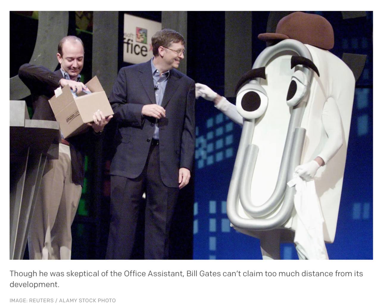Ну, а ребята из Venturebeat промыли косточки Clippy и его «отцу» Биллу Гейтсу. «Скрепка» Clippy появился в Microsoft Office в 1997 в качестве личного ассистента и вызвал неподдельное раздражение у пользователей. Большинство просто отключало Clippy в настройках как и автор этого обзора, чтобы избавиться от назойливых предложений о помощи в самый неподходящий момент. Clippy исчез из офисного пакета в 2007, чтобы вернуться в виде набора стикеров Microsoft Teams в 2021, чем вызвал кучу насмешек в соцсетях. Но в 2023 надсмешка над Clippy грозит обернуться неловкой ситуацией - стало понятно, что «скрепка» - это будущий «аватар» бота ChatGPT в офисных продуктах Microsoft. И больше всего «не смешно» таким гигантам как Alphabet/Google, Apple, Meta и Amazon.