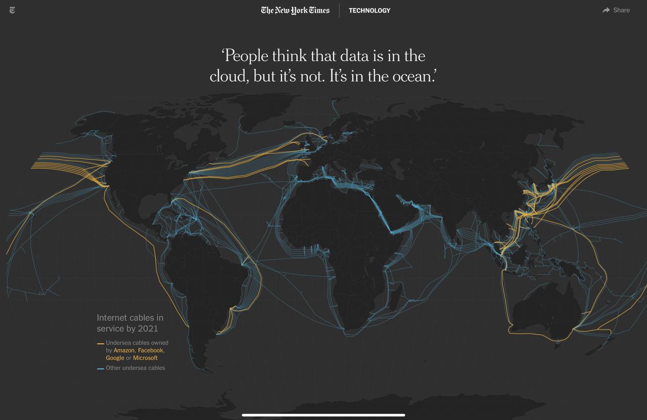 В 2021 году The New York Times на карте-схеме подводных информационных супермагистралей отметил, что данные не в облаках, а в океане.