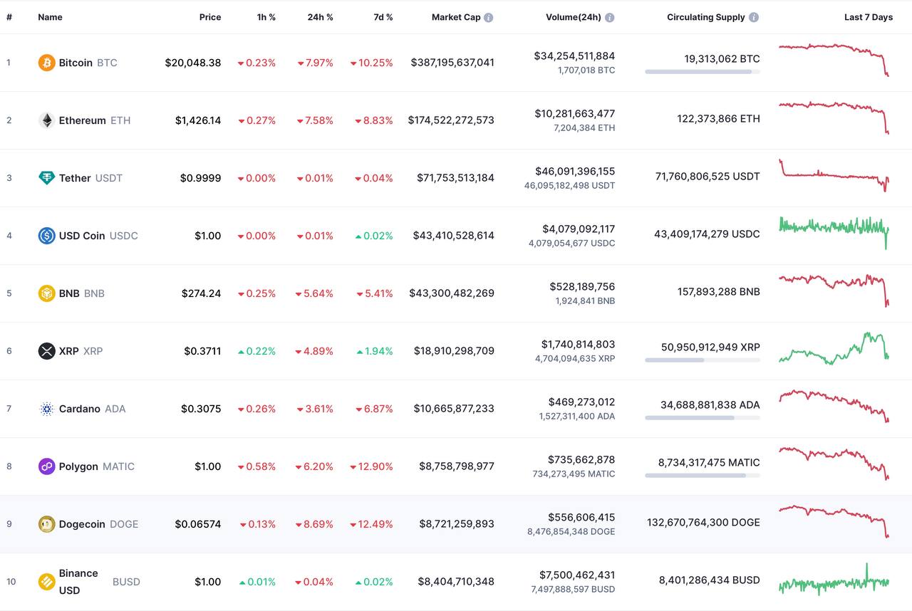 Что касается рынка крипты, то там продолжается медленное сползание вниз. Исключение составляют стейблкоины BUSD и USDC, обеспеченные долларом США, и монета XRP, используемая для межбанковских операций.