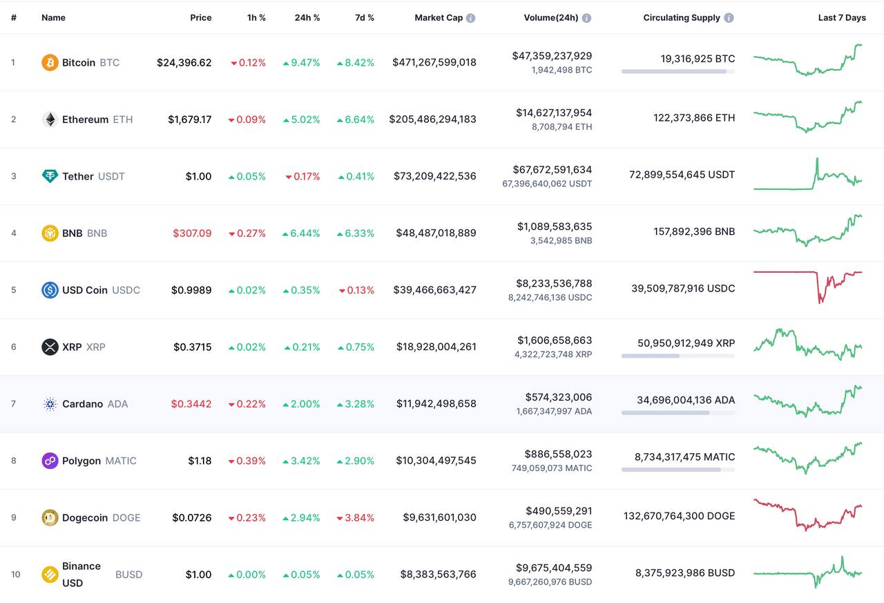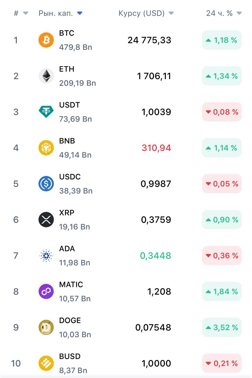 Публикуем актуальные на сегодняшнее утро курсы топ-10 криптовалют по размеру капитализации от Coinmarketcap