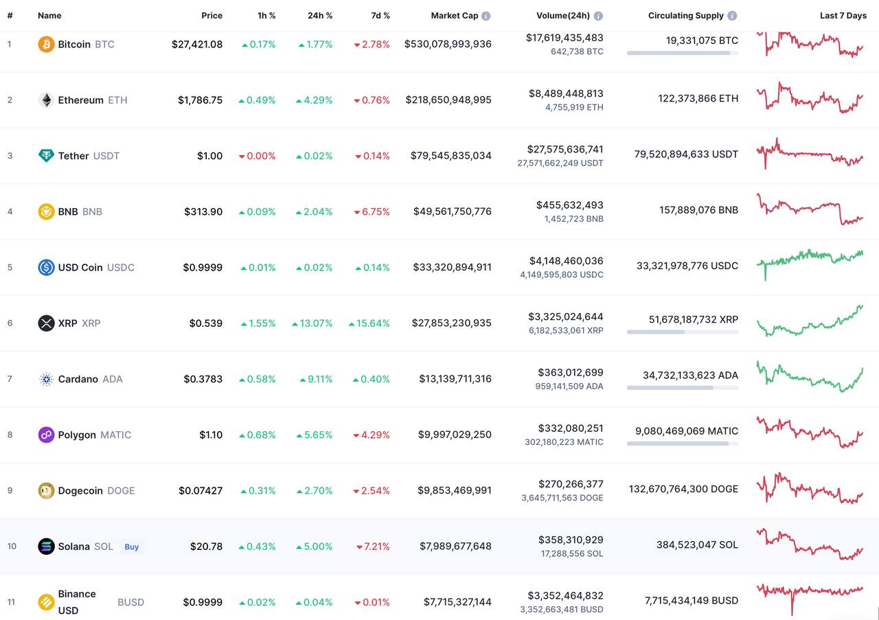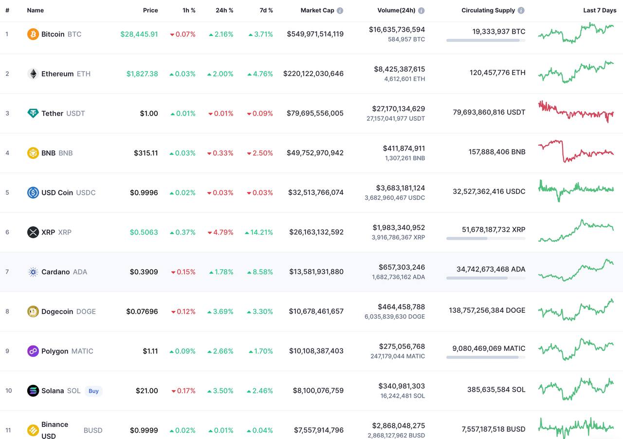 Сегодня биткойн (BTC) спокойно торгуется чуть выше 28 тысяч долларов, а эфир (ETH) - чуть ниже 1900. В остальном без особых изменений.