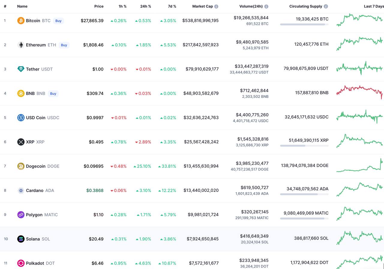 Сегодня биткойн (BTC) спокойно торгуется чуть выше 28 тысяч долларов, а эфир (ETH) - чуть ниже 1900. В остальном без особых изменений.