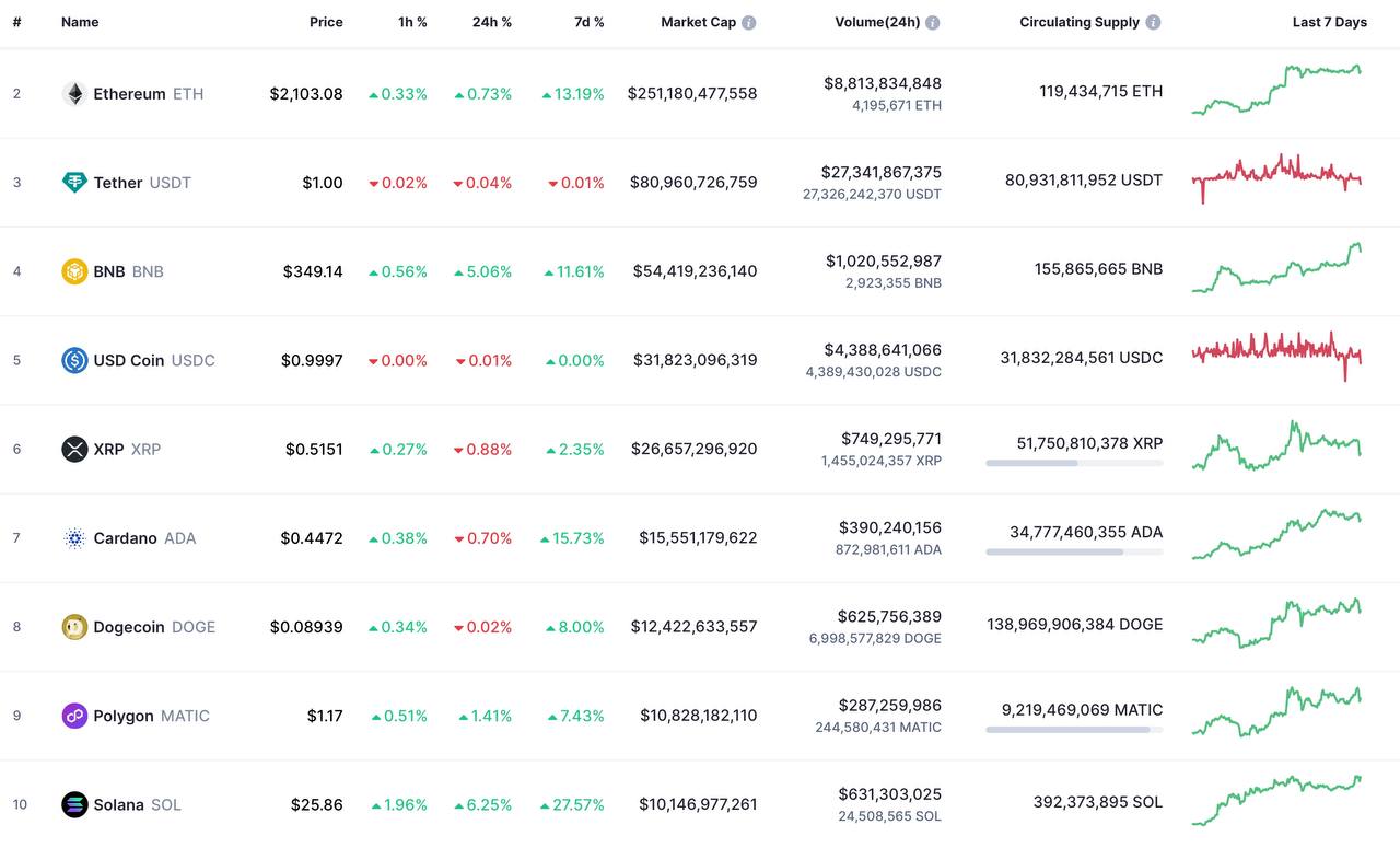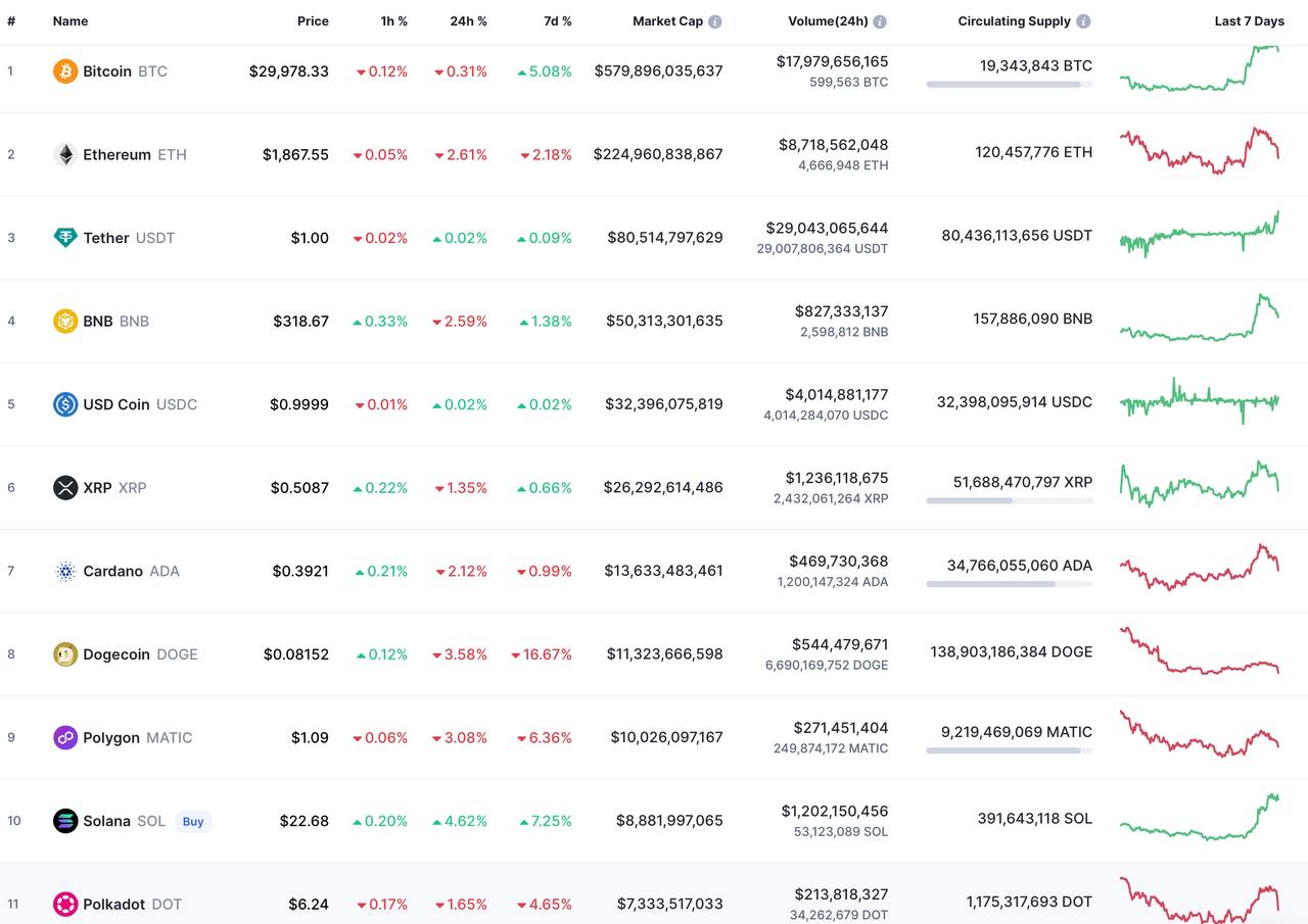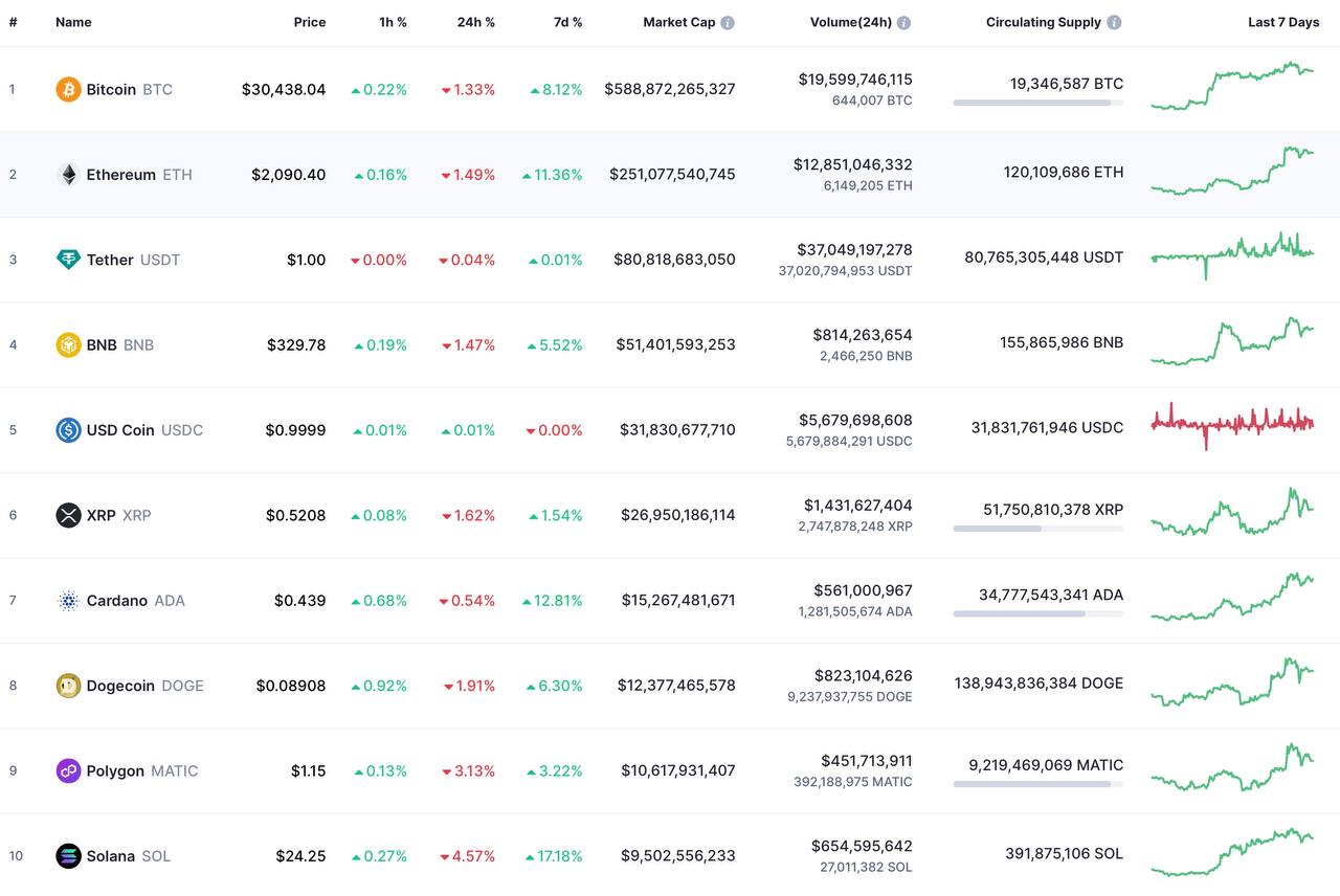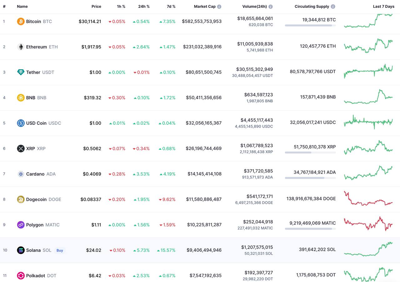 Биткоин (BTC) дороже 30 тысяч долларов, эфир (ETH) за последние 24 часа вырос на 10% и преодолел сопротивление в районе 2000 долларов после успешного хардфорка Shanghai-Capella (Shapella). Есть прогнозы о росте ETH на 70% до конца года.