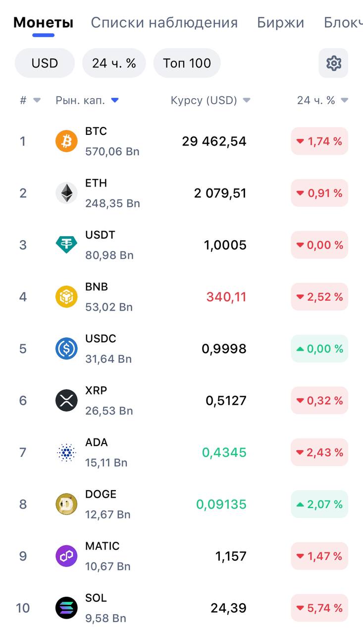 Публикуем актуальные на этот час курсы топ-10 криптовалют по размеру капитализации.