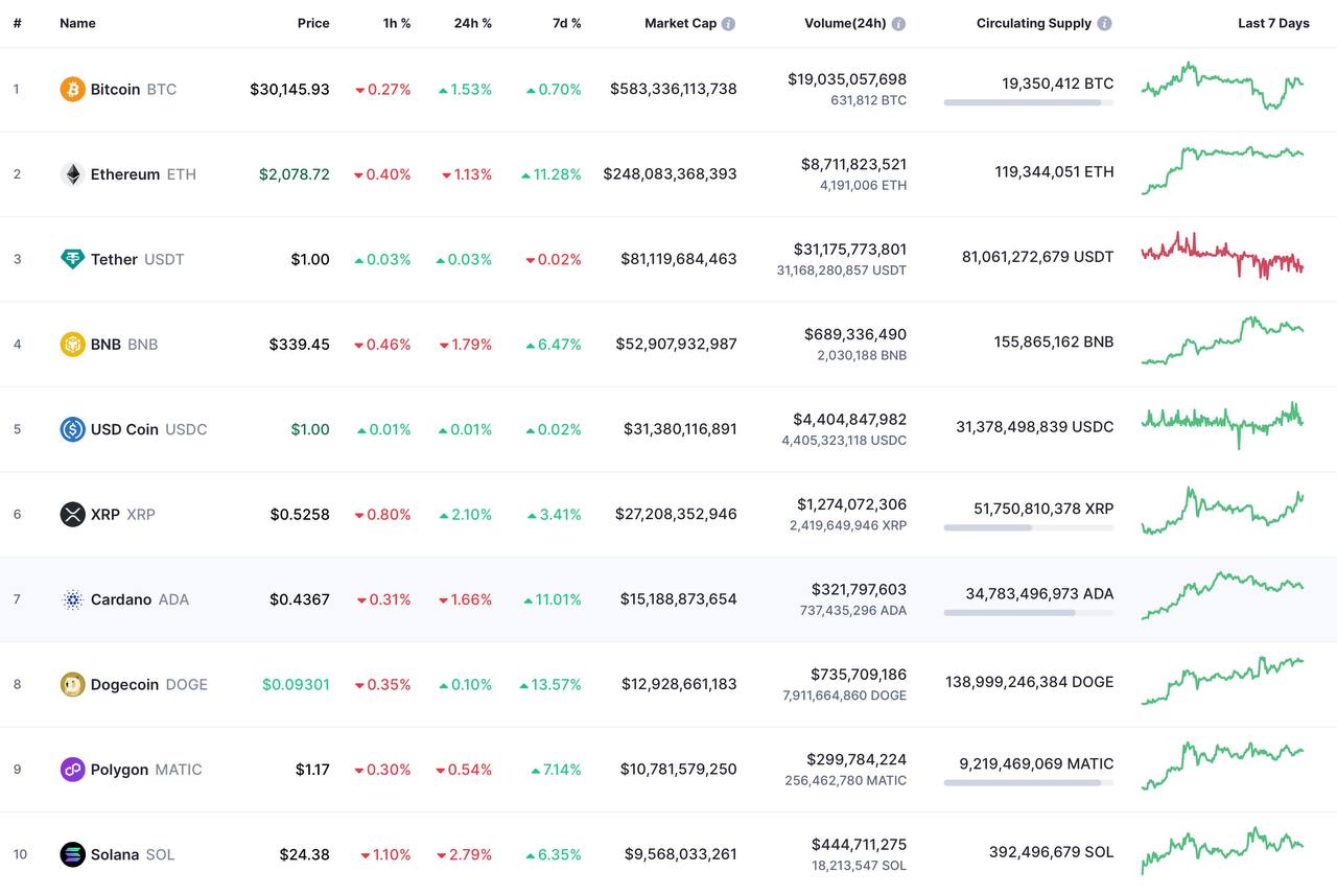 Биткоин (BTC) дороже 30 тысяч долларов, эфир (ETH) за последние 24 часа вырос на 10% и преодолел сопротивление в районе 2000 долларов после успешного хардфорка Shanghai-Capella (Shapella). Есть прогнозы о росте ETH на 70% до конца года.
