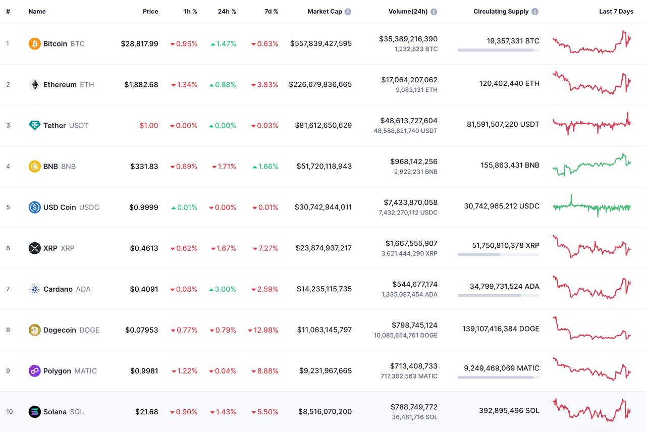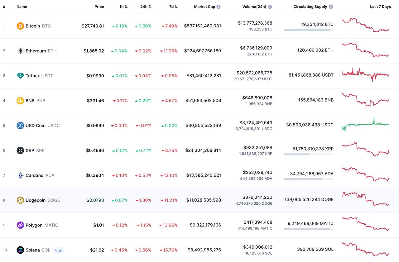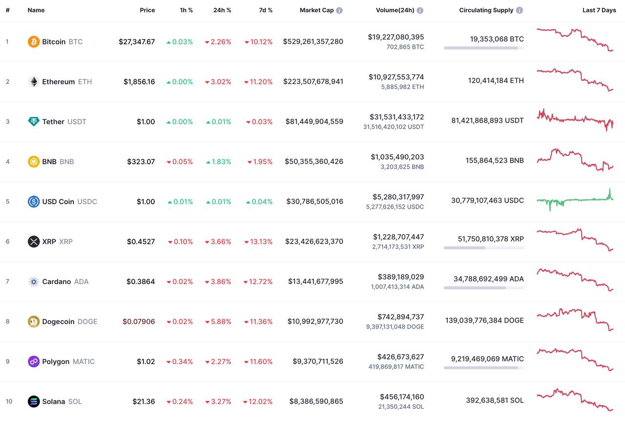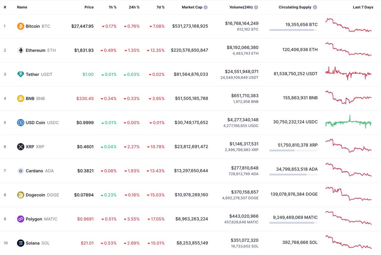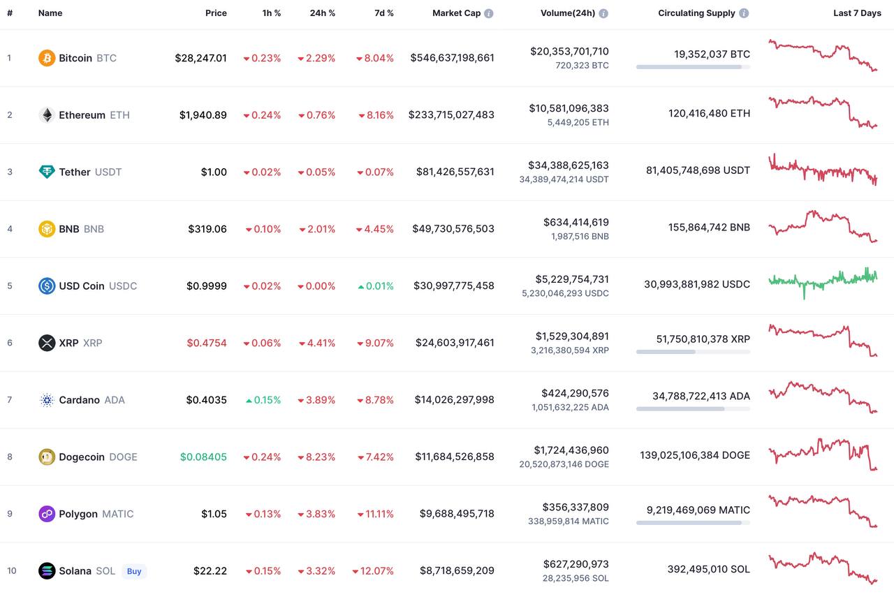 Биткоин (BTC) торгуется дешевле 28 тысяч долларов, а эфир (ETH) — ниже 1900 долларов.