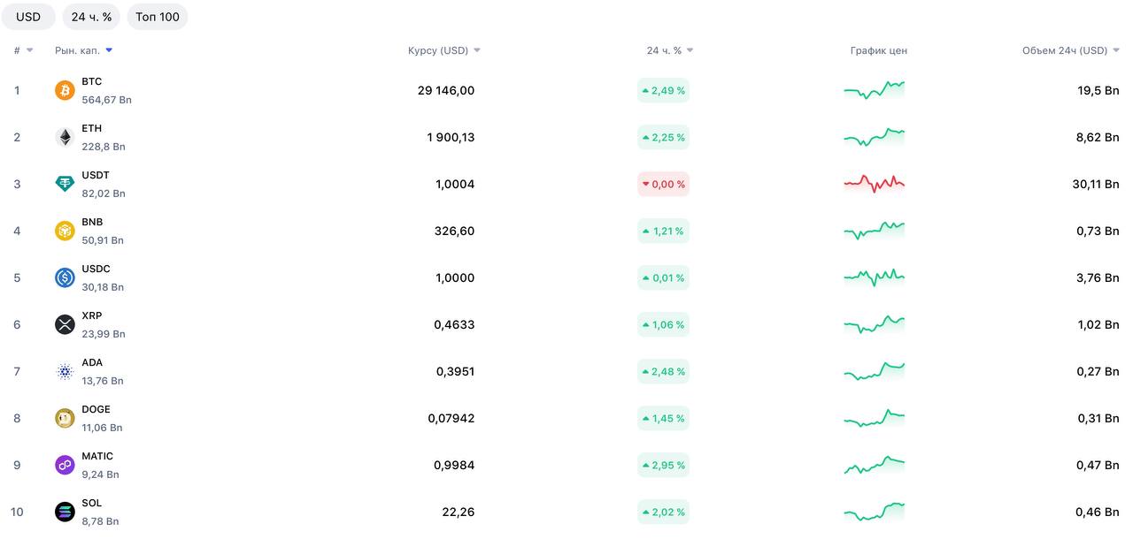 Что касается рынка криптовалют, то там и сегодня без особых перемен. Биткоин (ВТС) дороже $29000, эфир (ETH) ушел выше $1900, и в целом основные монет подорожали на 2-3% за последние 24 часа.