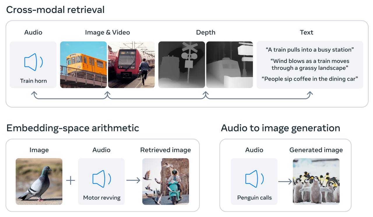 Марк Цукерберг презентовал вчера в Meta Channel революционную модель искусственного интеллекта ImageBind, способную обучаться на основе 6 различных типов информации: текста, изображений/видео и аудио, данных пространственной глубины (3D), теплового (инфракрасного излучения) и инерциального измерения (IMU), с помощью которого рассчитывается движение и положение объекта в пространстве.