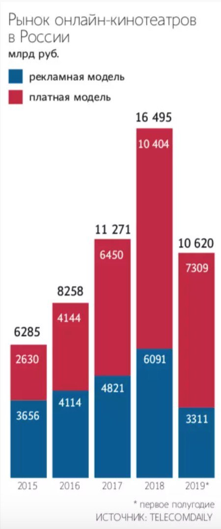 Рынок видеосервисов стал расти быстрее: их доходы за этот же период увеличились на 44,3% до 10,6 млрд рублей, что выше темпов в 2018 году, когда рост составлял 32%. По прогнозу Telecom Daily, за весь год видеосервисы (в том числе YouTube, iTunes, Google Play) заработают в России около 21,5 млрд рублей. Для сравнения, в 2012 году этот рынок не превышал 1 млрд рублей.