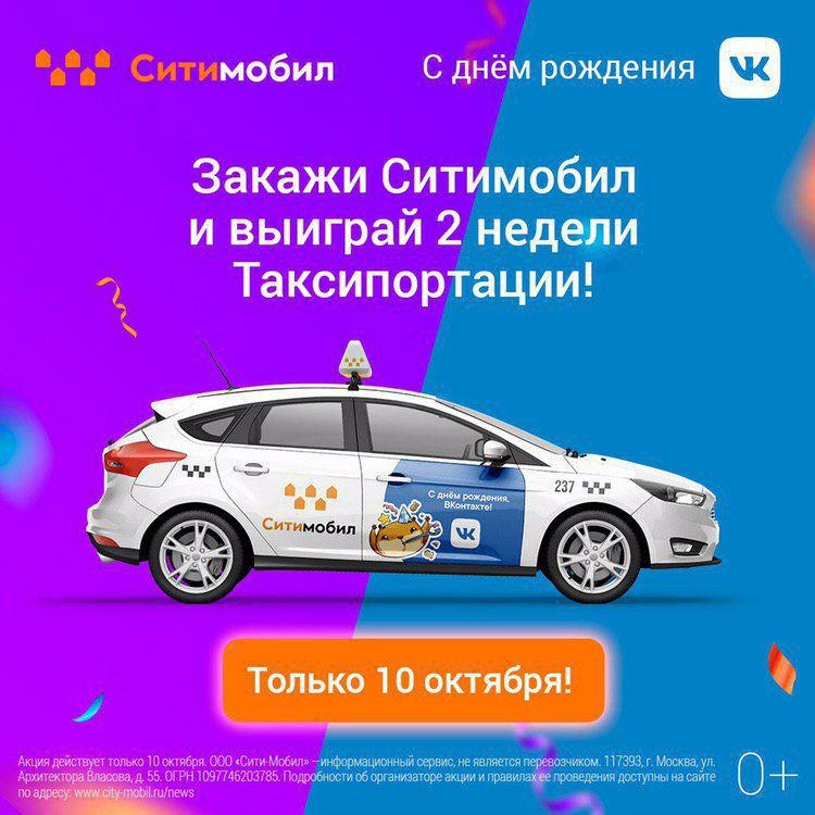 Только сегодня, в день рождения ВКонтакте, на улицах Петербурга появятся праздничные машины. Если вы вызовете Ситимобил, и к вам приедет одна из них, вы сможете выиграть 2 недели бесплатной таксипортации и специальные подарки от ВКонтакте