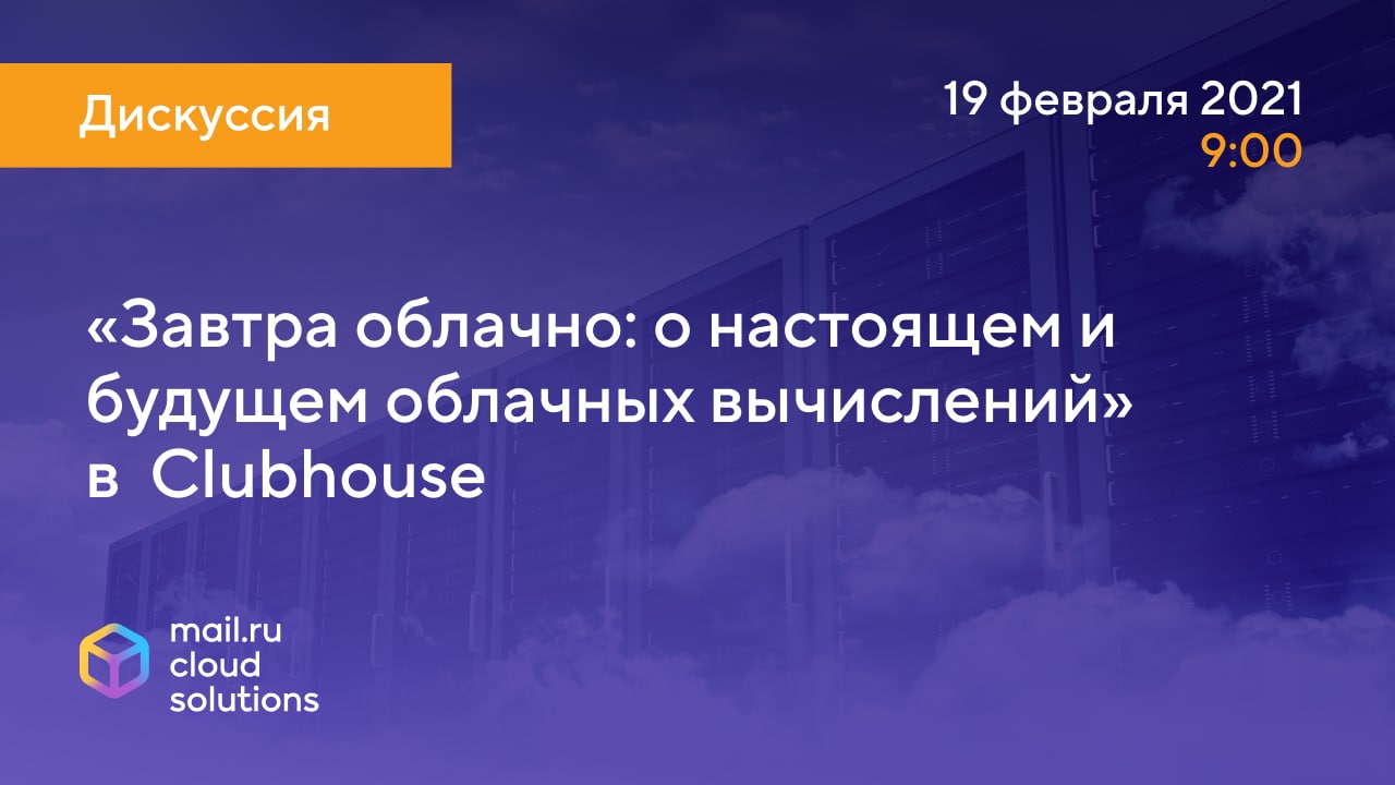 В 9:00 начинаем в Сlubhouse дискуссию «Завтра облачно: о настоящем и будущем облачных вычислений».
