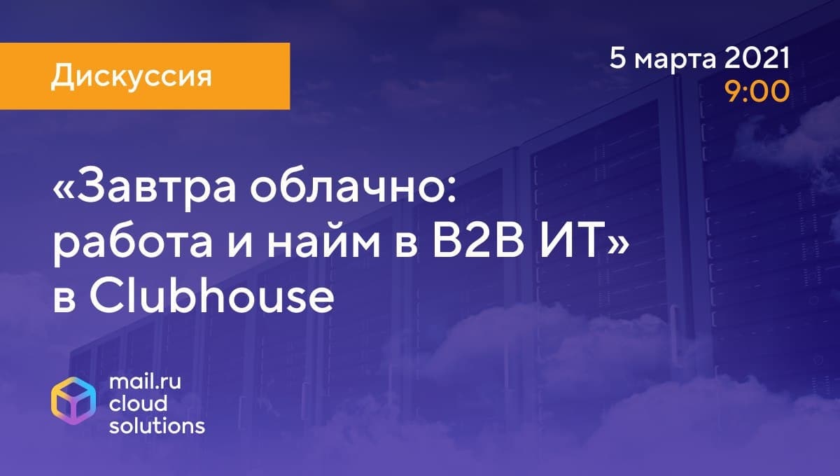 В эту пятницу мы снова собираемся в Clubhouse: вместе с Ильей Летуновым, руководителем Mail.ru Cloud Solutions и Tarantool, Анной Пановой, Head of Recruitment & Talent Acquisition Каspersky, Алексеем Корякиным, техническим директором Tarantool, Александром Салтановым, техническим директором Mail.ru Cloud Solutions, обсудим вопросы работы и найма в сферах B2B ИТ и высоких технологий в целом.