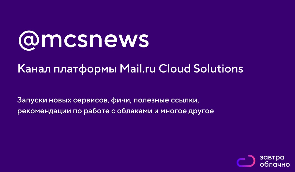 Тем, кто пользуется облачными сервисами, стоит подписаться на канал Mail.ru Cloud Solutions — экосистемы облачных сервисов, с помощью которой можно построить IT-систему любого масштаба.