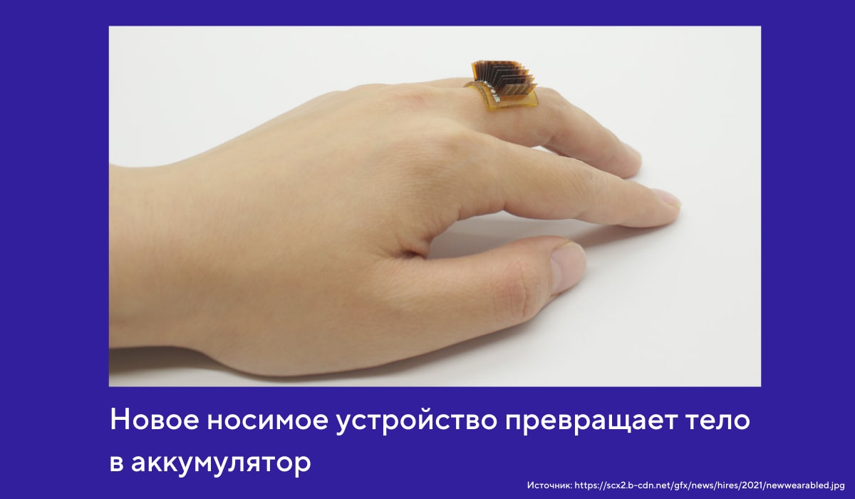✅ Сейчас устройство может генерировать около 1 вольта на каждый квадратный сантиметр кожи. Этого достаточно, чтобы питать часы или фитнес-трекеры. Можно объединить несколько устройств и увеличить вырабатываемую энергию.