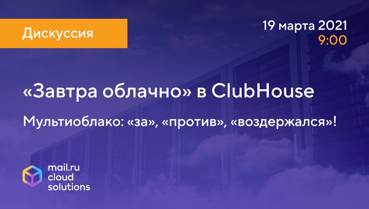 В эту пятницу, 19 марта, мы собираемся в Clubhouse вместе с Дмитрием Лазаренко, директором по продукту Mail.ru Cloud Solutions, Александром Салтановым, техническим директором MCS, Александром Ложечкиным, руководителем архитектуры партнеров в регионе ЕМЕА в Amazon Web Services, Кириллом Диановым, руководителем направления Multicloud Онланта и Андреем Дубровиным, архитектором облачных решений Crayon, чтобы поговорить о мультиоблачной стратегии.