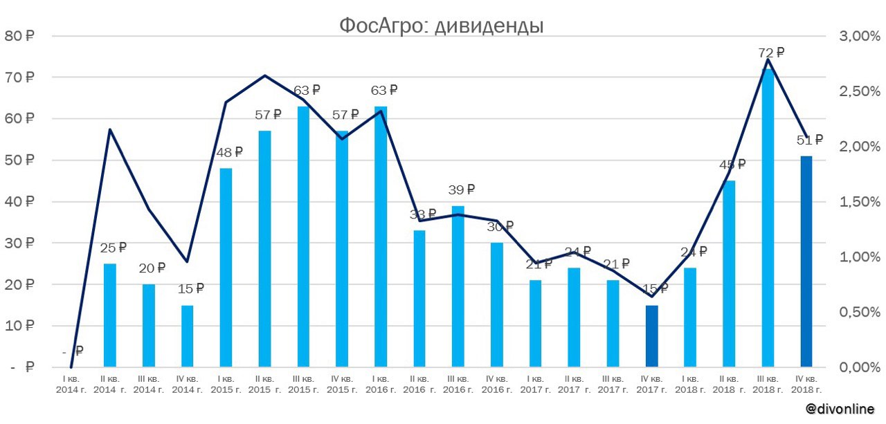 Совет директоров ФосАгро рекомендовал выплатить дивиденды за IV кв. 2018 г. в размере 51 руб. на акцию (17 руб. на GDR) из прибыли, сформированной по состоянию на конец 2018 г. Всего на финальные дивиденды будет направлено 6,6 млрд рублей. Текущая дивидендная доходность составляет 2,1%. Годовое собирание акционеров ФосАгро состоится 24 мая, реестр к собранию закроется 29 апреля. Датой закрытия реестра на получение дивидендов предложено утвердить 10 июня.