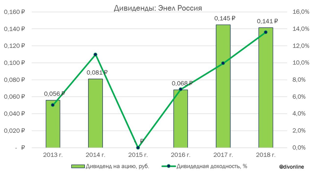 Совет директоров Энел Россия рекомендовал годовому собранию акционеров принять решение о выплате дивидендов за 2018 г. в размере 0,14 руб. Общий размер дивидендов на обыкновенные акции может превысить 5 млрд руб. Текущая дивидендная доходность составляет 13,3%.