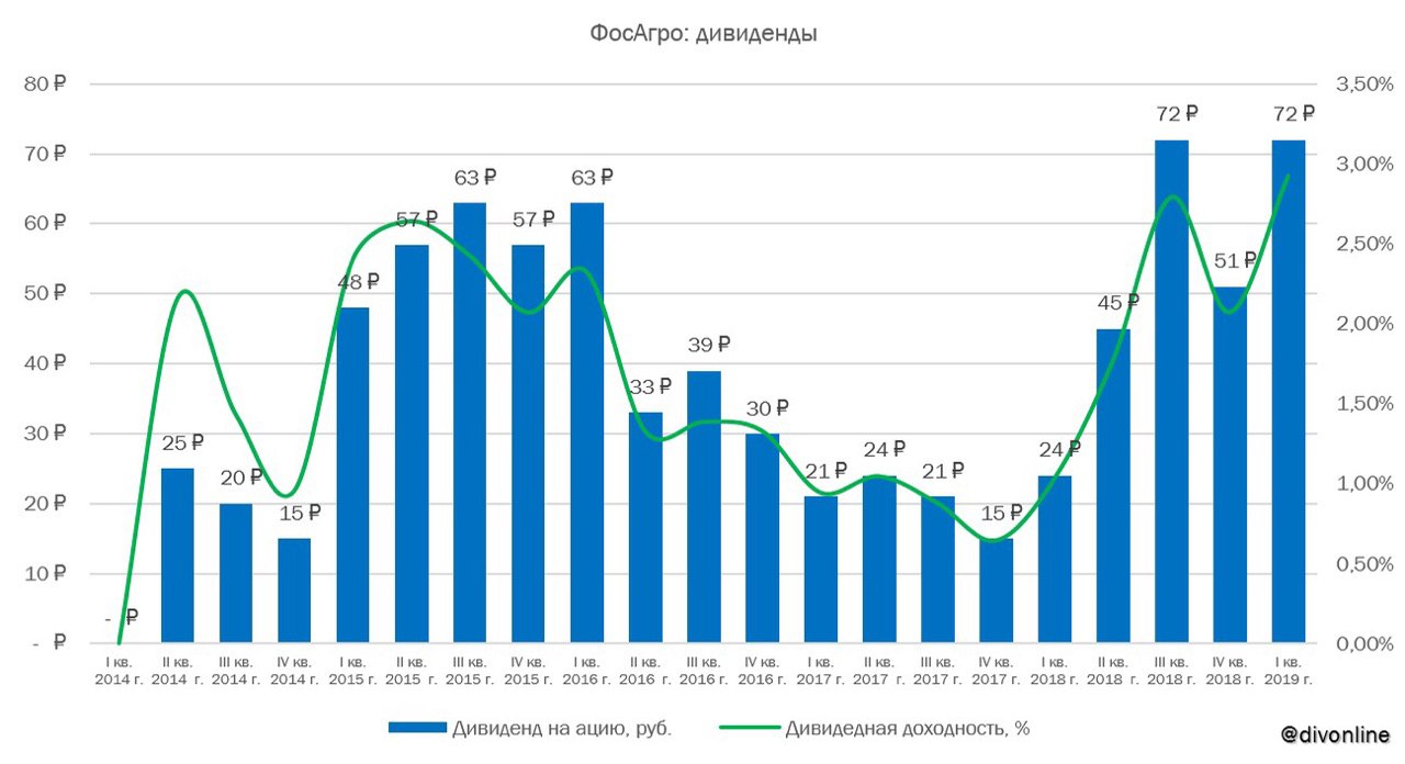 Совет директоров #ФосАгро рекомендовал направить на дивиденды за I кв. 2019 г. в размере 72 руб. на акцию. Общая сумма выплат составит 9,3 млрд рублей. Текущая квартальная дивидендная доходность составляет 3,1%. Годовое собрание акционеров компании состоится 24 июня 2019 г. Закрытие реестра для получения дивидендов состоится 10 июля 2019 г. #PHOR