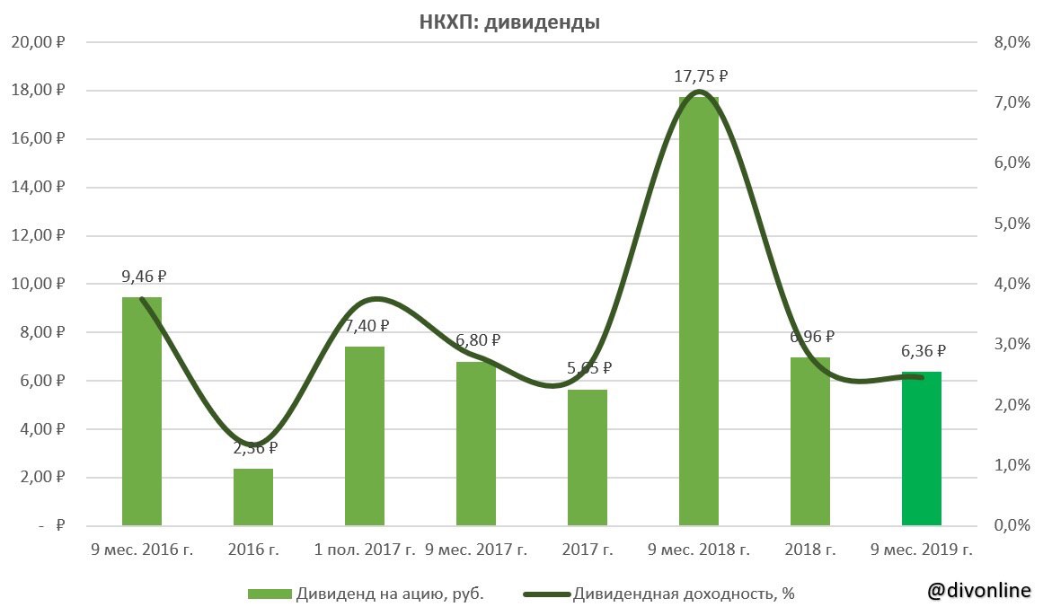 Совет директоров #НКХП рекомендовал выплатить дивиденды за 9 мес. 2019 г. в размере 6,36 руб. на акцию. Всего на дивиденды планируется направить 429,92 млн руб. Текущая дивидендная доходность составляет 2,5%. Закрытие реестра на получение дивидендов состоится 15 января 2020 г. #NKHP
