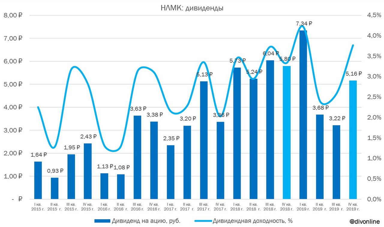 Совет директоров НЛМК рекомендовал дивиденды за IV кв. 2019 г. в размере 5,16 руб. на акцию, что соответствует 148% свободного денежного потока. Таким образом, дивиденд на акцию снизился с 5,8 руб. до 5,16 руб. по сравнению с аналогичным периодом 2018 г. Текущая квартальная дивидендная доходность составляет 3,8%. Закрытие реестра состоится 6 мая 2020 г. #НЛМК #NLMK