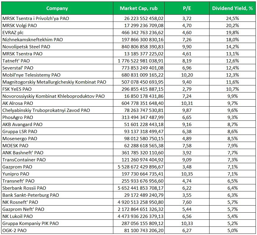 Учитывая текущие снижение котировок российского рынка акций, мы подобрали крупные компании с максимальной оценкой по P/E вблизи 10, а также с высокой дивидендной доходностью за последние 12 месяцев.