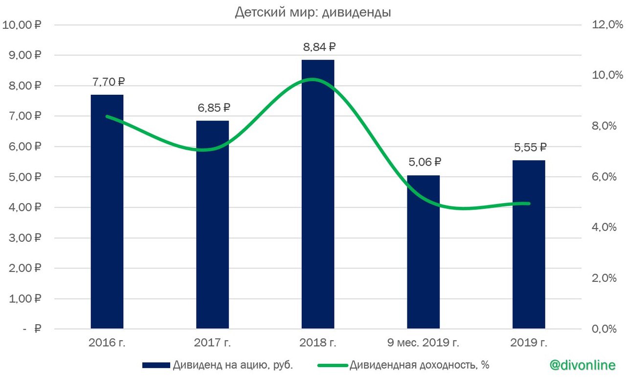 Детский мир отчислятся о росте чистой прибыли за 2019 г. на 15% по сравнению с 2018 г. – до 6,5 млрд руб. Таким образом, финальный дивиденд на акцию составит 5,55 руб., текущая дивидендная доходность составляет 5%. #ДетскийМир #DSKY