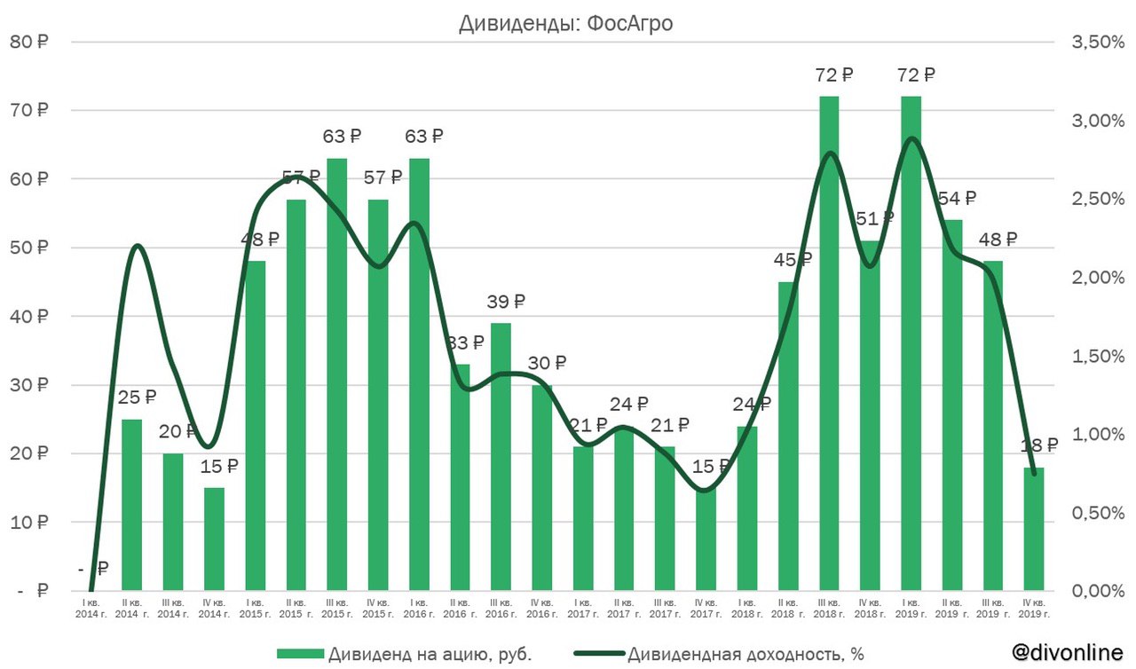 Совет директоров ФосАгро рекомендовал дивиденды за IV кв. 2019 г. в размере 18 руб. на акцию. Общая сумма выплат акционерам составит 2,33 млрд руб. Текущая квартальная дивидендная доходность составляет 0,75%. #ФосАгро #PHOR