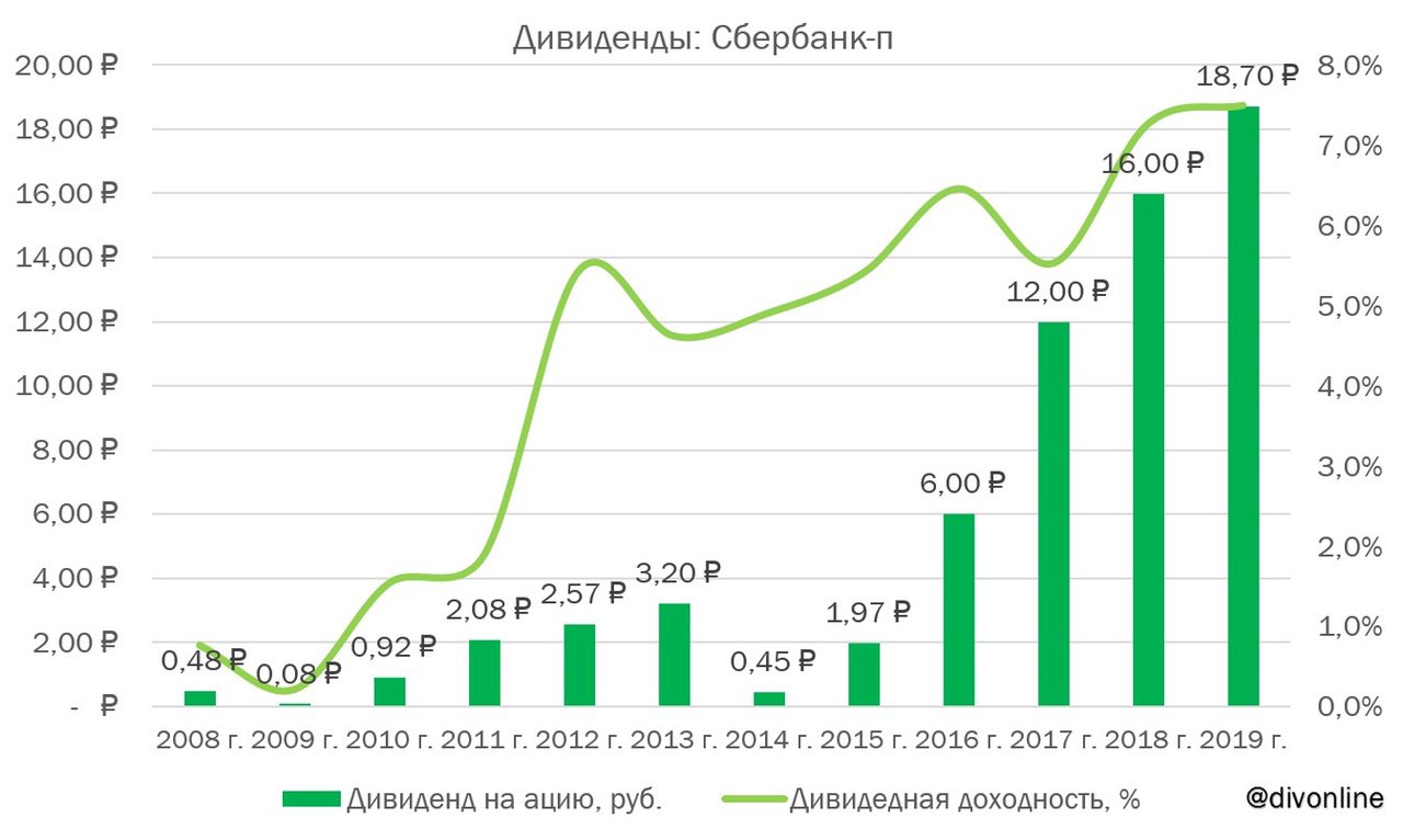 Сбербанк отчитался о росте чистой прибыли за 2019 г. по МСФО в размере 845 млрд руб. Таким образом, дивиденд на акцию за 2019 г. составит 18,7 руб. Текущая дивидендная доходность по обыкновенным акциям составляет 7,5%, по привилегированным - 8,2%. #Сбербанк #SBERP #SBER