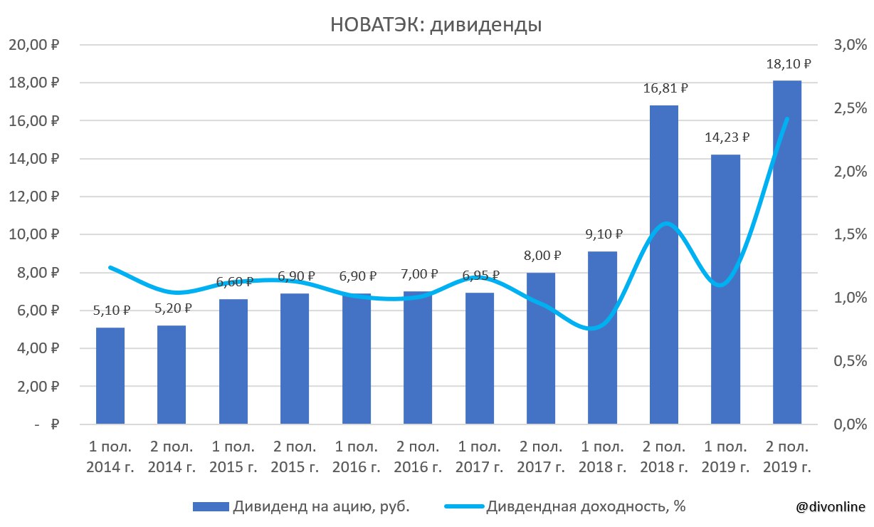 Совет директоров НОВАТЭК рекомендовал дивиденды за II пол. 2019 г. в размере 18,1 руб. на акцию. Текущая дивидендная доходность составляет 2,4%. Закрытие реестра для получения дивидендов назначено на 8 мая 2020 г. #НОВАТЭК #NVTK