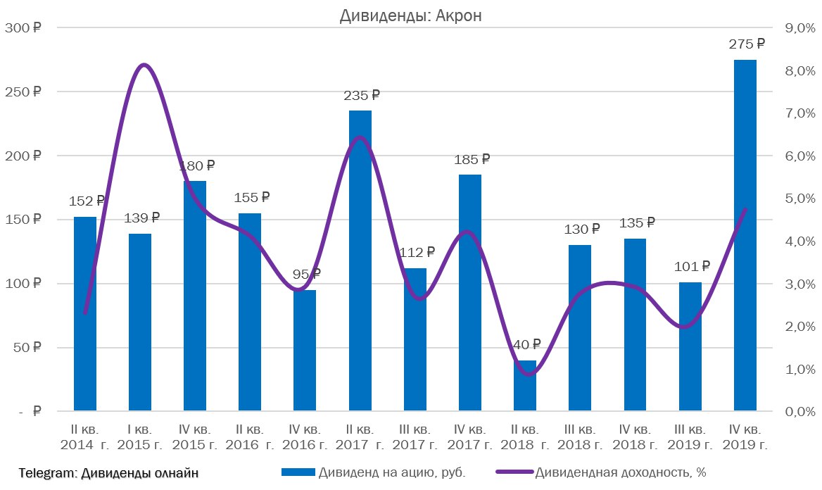 Совет директоров Акрона рекомендовал выплатить финальные дивиденды за 2019 г. в размере 275 руб. на акцию. Текущая дивидендная доходность составляет 4,7%. Дата закрытия реестра для получения дивидендов назначена 9 июня 2020 г. #AKRN #Акрон