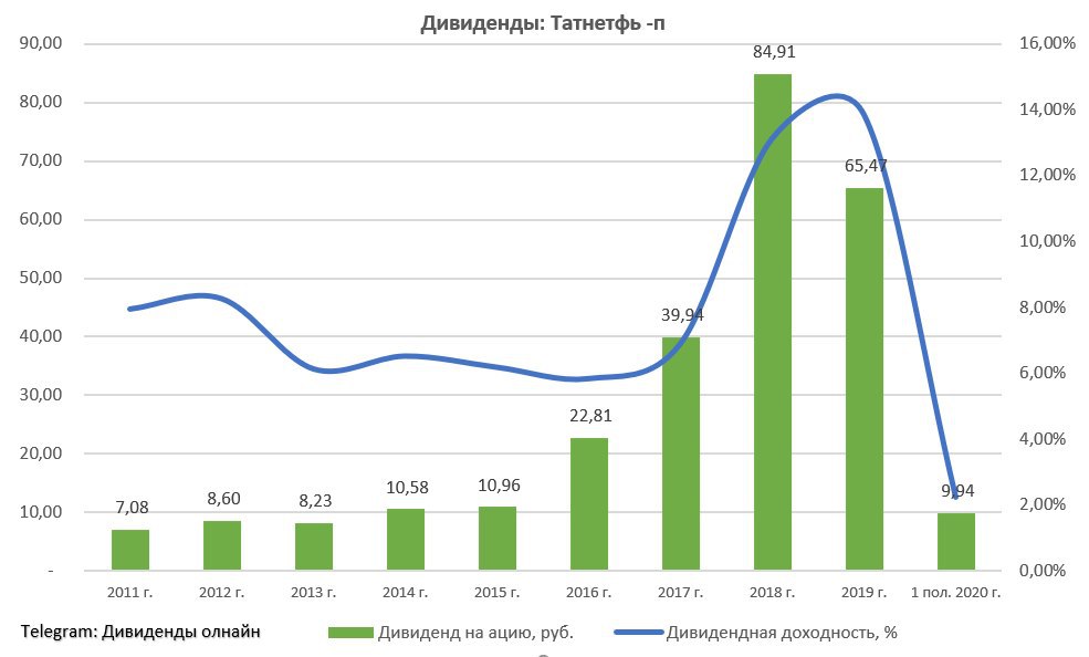 Акционеры Татнефти приняли решение выплатить промежуточные дивиденды за I пол. 2020 г. в размере 9,94 руб. на оба типа акций. Текущая дивидендная доходность по привилегированным акциям составляет 2,26%, по обыкновенным – 2,14%. Дата закрытия реестра для получения дивидендов назначена на 12 октября 2020 г. #TATN #TATNP