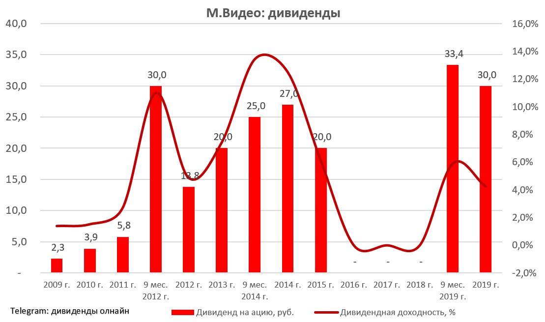 Совет директоров М.Видео рекомендовал выплатить дивиденды за 2019 г. в размере 30 руб. на акцию. Текущая дивидендная доходность составляет 4,2%. Дата закрытия реестра для получения дивидендов назначена на 20 ноября 2020 г. #MVID