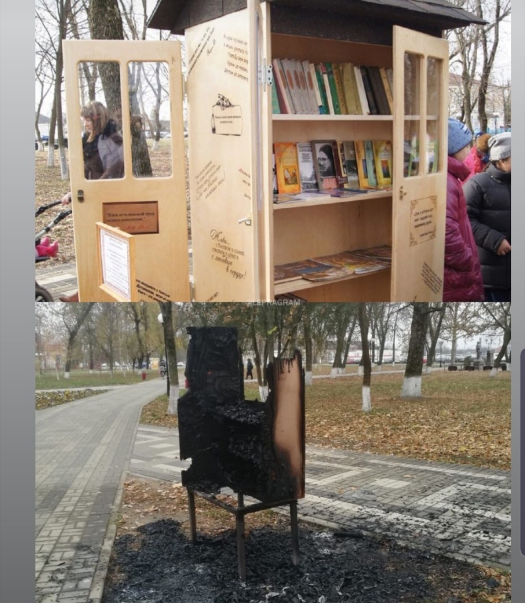 На днях наше общество не менее амбициозно предотвратило очередную попытку внедрения западных ценностей в наше духовное общество: на улице Краснодара установили бесплатный шкаф для обмена книгами. Чтоб ходил наш человек с дохуя умным ебальником, начитавшись основ прозападной либеральной дряни? К счастью изощренная диверсия вовремя была распознана и шкафчик для книг ликвидирован проверенным дедовским методом! Можно выдохнуть...