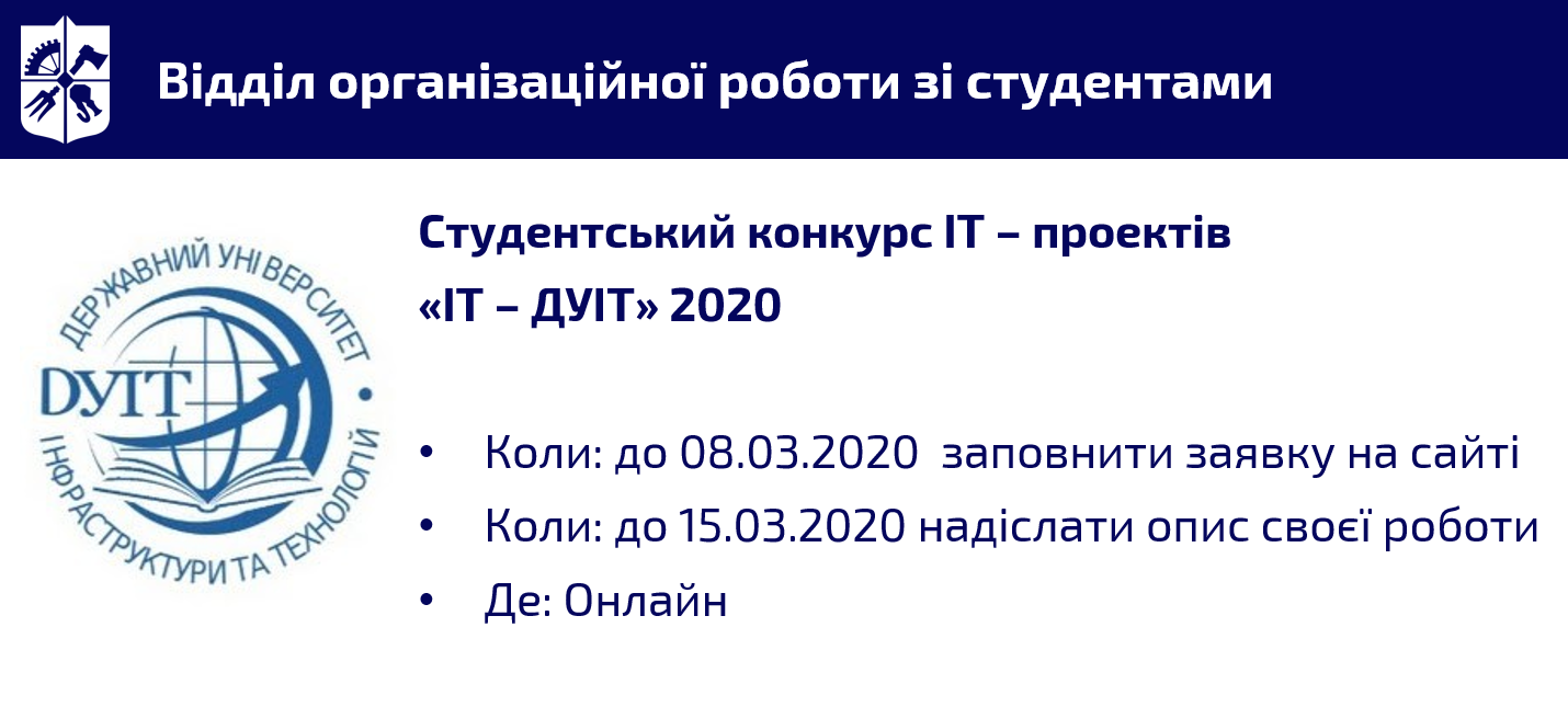 🗓 Державний університет інфраструктури та технологій проводить Студентський конкурс IT – проектів «IT – ДУІТ» 2020