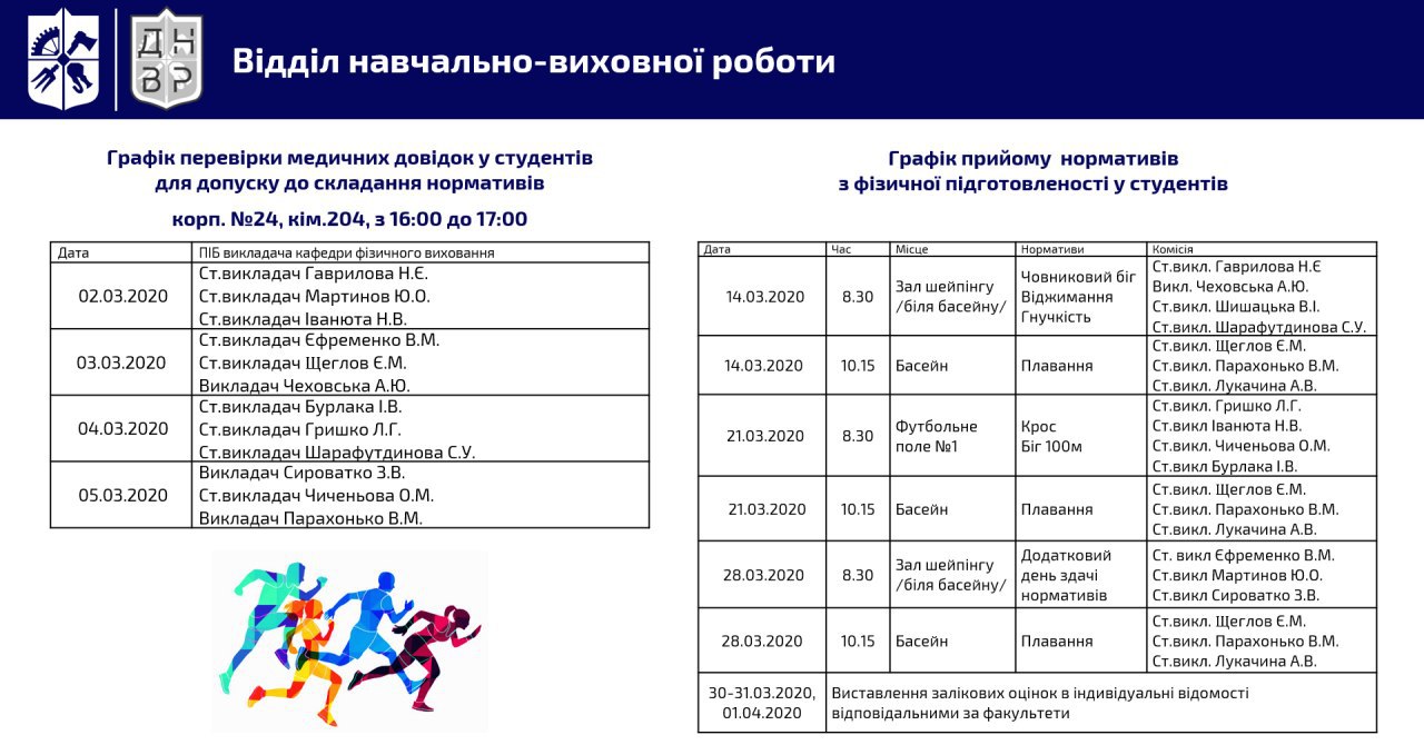 🔹 Задля вирішення цієї ситуації, за погодженням зі студентською радою університету, кафедрою фізичного виховання розроблено графік складання нормативів з фізичної підготовки.