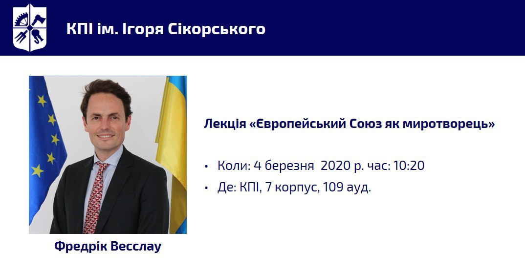🗓 Запрошуємо прослухати відкриту лекцію Фредріка Весслау «Європейський Союз як миротворець»
