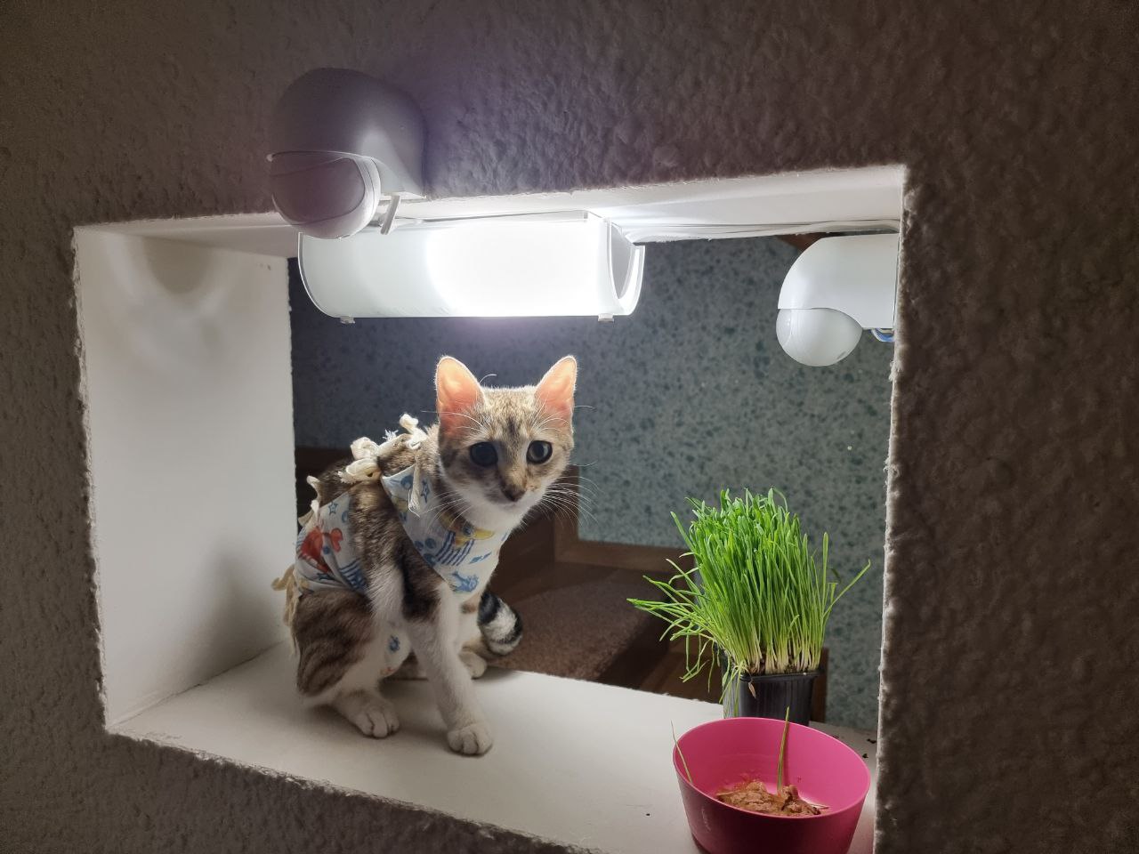 Дело было так. Прошла неделя, и на ночь глядя мы решили снять с кошки попонку. Она не сразу поняла, что происходит, и даже на всякий случай пыталась царапаться и вырываться. Когда попонку сняли, кошка в ужасе убежала в коридор, и целый час там было очень тихо. Вылизывалась с головы до ног, пыталась пригладить вставшую дыбом шерсть.