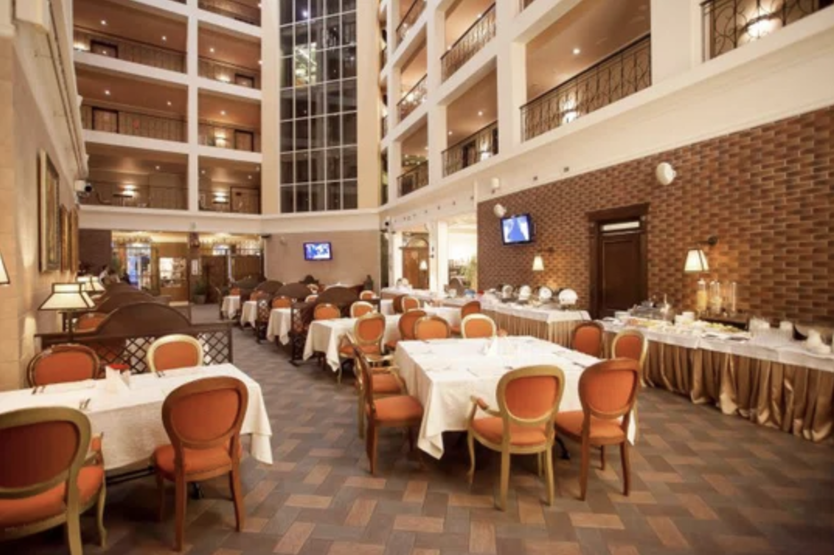 Еще при заселении обратил внимание, что этажи сделаны по кругу в виде балконов, а в середине огромное пустое пространство. Но внизу не холл отеля, а ресторан, в котором проходят завтраки, обеды и все такое.
