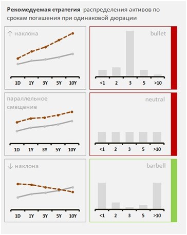 Долгосрочные облигации выиграют в стоимости от снижения ставок по облигациям с погашением от 4-5 лет. Ценные бумаги с короткой дюрацией позволят не потерять от увеличения краткосрочных процентных ставок.