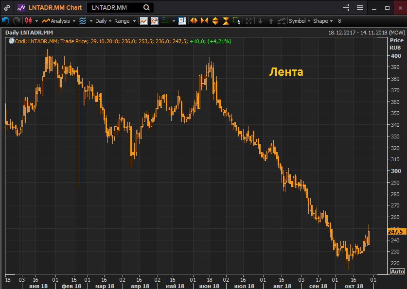 Несмотря на плохие результаты, акции растут в понедельник. Лента объявила выкуп акций на сумму до 11,6 миллиарда рублей, то есть 10% от GDR. "Мы твердо убеждены, что текущая рыночная оценка не отражает фундаментальной стоимости компании. Решение о запуске программы обратного выкупа показывает нашу уверенность в бизнес-модели", - Дюннинг.