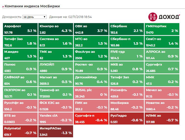 Индекс МосБиржи показал рост на 2,3% в среду. Лучше рынка Яндекс после новостей о том, что его акционеры думают закрепить контроль над компанией за руководством и обсуждают схему, по которой 60% голосующих прав в Яндексе передаются в фонд, который будет контролировать основатель компании Аркадий Волож и группа российских топ-менеджеров. https://dohod.ru/ik/analytics/stockmap/