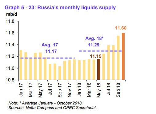 Россия увеличила добычу до нового максимума в постсоветской истории - отчёт ОПЕК. Показатель составил 11,6 млн баррелей/сутки в октябре. Основной прирост идет за счёт Роснефти.