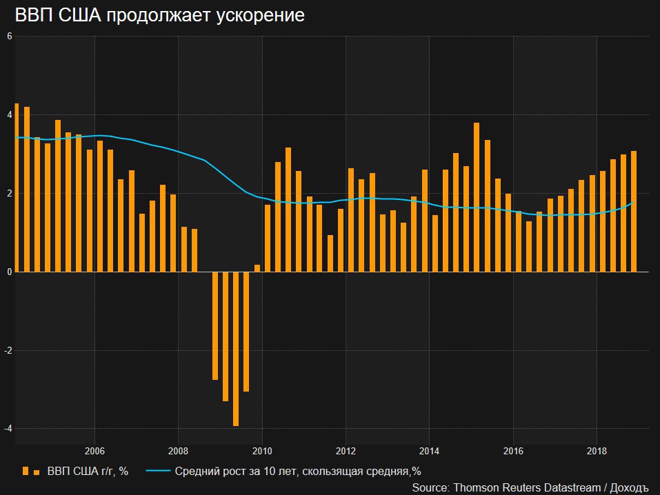🇺🇸2 года назад Трамп говорил, что "нет никаких оснований, почему экономика не может расти на 4%, 5% или 6%". Пока цель остается недостижимой - ВВП США увеличился на 3,1% в 4кв 2018г в годовом выражении.