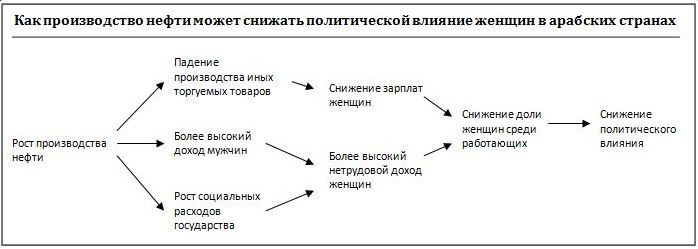 В конечном итоге, можно сформулировать вполне логичную причинно-следственную связь между ростом нефтяных доходов и неравеснтвом женщин в арабских странах (см. картинку ниже).