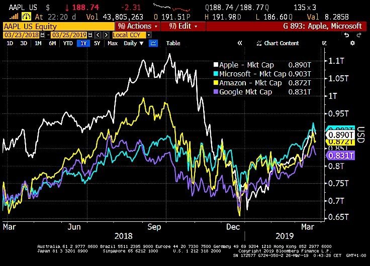 На участников рынка новые направления бизнеса Apple впечатления не произвели. Акции компании потеряли 1,2%, капитализация оказалась вновь чуть ниже Microsoft. Выручка Apple в 4 квартале 2018 года упала на 4,5% в годовом выражении до $84,3 млрд, что не случалось несколько десятилетий.