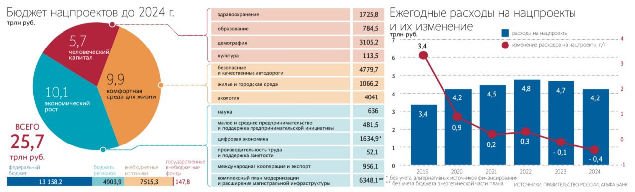 К 2024 г. Россия должна войти в пятерку крупнейших экономик мира по уровню ВВП на душу населения (по паритету покупательской способности), обогнав Германию. Именно такой является ключевая цель правительства избранного на четвертый срок президента Владимира Путина. Она обозначена в очередном майском указе президента, подписанном им 7 мая 2018 г. Ради ее достижения чиновники разработали 12 национальных проектов, на которые в течение 2019–2024 гг. будет потрачено 25,7 трлн руб. Чтобы найти на них деньги, власти повысили с 2019 г. НДС. Еще 500 млрд руб. в год они собираются занимать, выпуская облигации федерального займа для фонда развития. В целом половину финансирования обеспечит федеральный бюджет, 30% – внебюджетные источники и 20% – региональные бюджеты. Но обеспечат ли потраченные триллионы опережающий экономический рост?