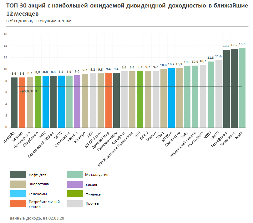Top-30 акций с наибольшей ожидаемой дивидендной доходностью, к текущим ценам