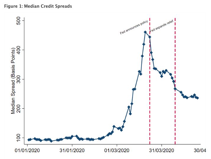 Этот график показывает как работа ФРС отразилась но нормализации кредитных спредов в США (разницы между доходностью надежных и менее надежных облигаций).