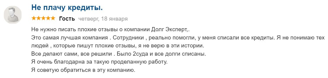 Для нас главное, что отрицательных отзывов от НАШИХ клиентов можно пересчитать по пальцам. И с каждым автором мы по возможности связались и предложили вариант решения возникшей ситуации. Долг Эксперт дорожит своей репутацией и ведет все дела честно, опираясь на официальный договор💯