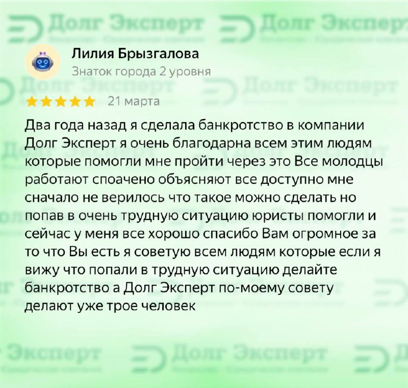 Спустя почти два года после завершения процедуры Лилия поделилась своим отзывом: "Мне сначала не верилось, что это возможно... Но юристы Долг Эксперт помогли мне пройти через всё это. Теперь у меня всё хорошо. Спасибо за то, что вы есть!"